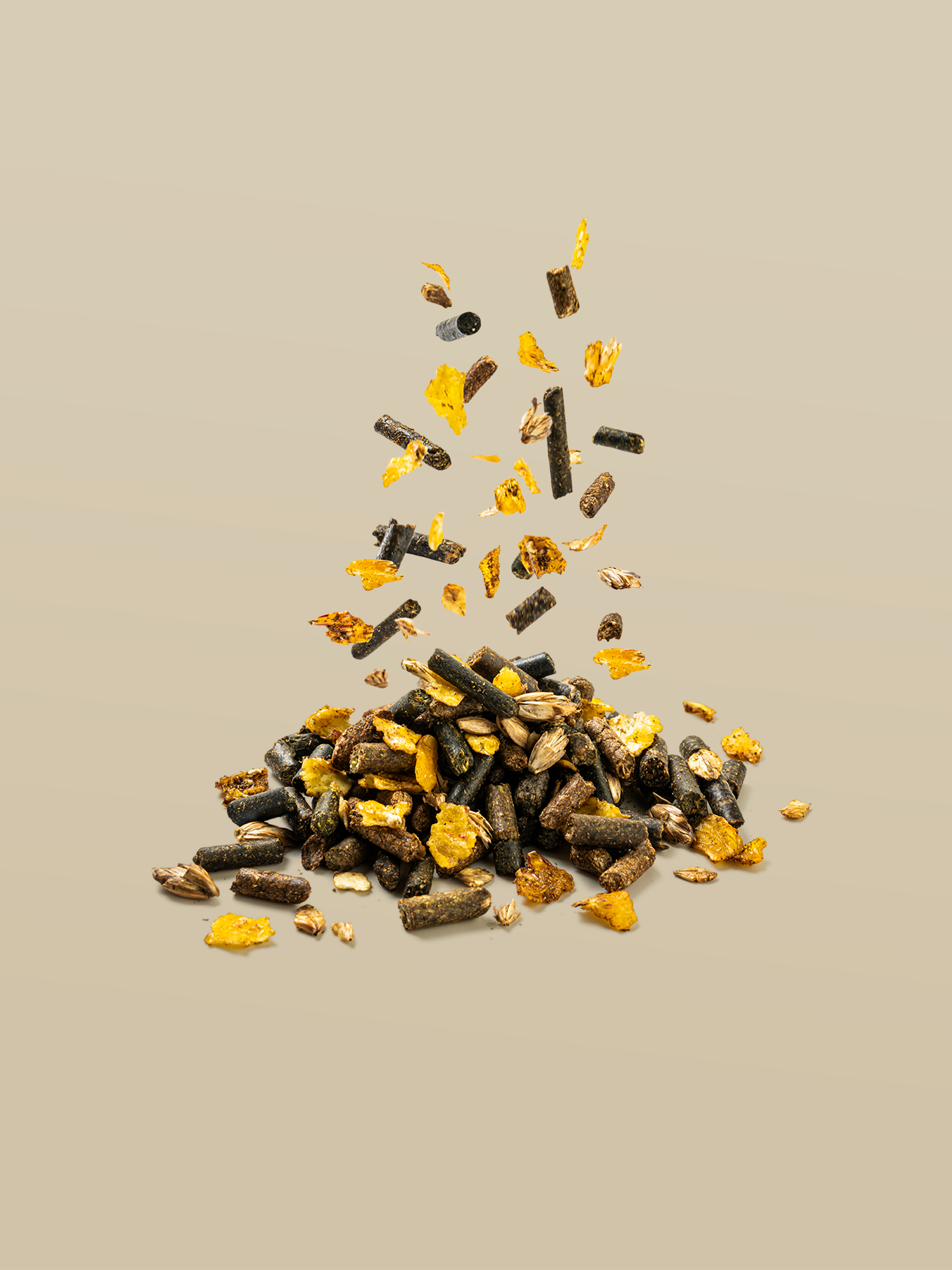 Lucerna, lenmag héj, cukorrépa pép, árpa, lenmag pehely, árpa pehely, kukorica pehely, tönköly, szójaolaj, búzakorpa, lenmag, nádkivonat, kalcium-karbonát, nátrium-klorid, cukorrépa melasz, rizskorpa, szója héj, lenolaj, monokálcium-foszfát, lóbab, hámozott kukorica, magnézium-oxid, búza