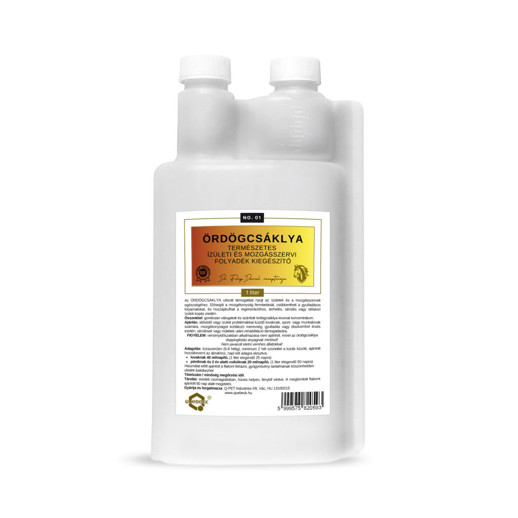 1 liter ÖRDÖGCSÁKLYA kivonat elegendő kb. 25 napig, egy átlagos 500 kg súlyú lónak.